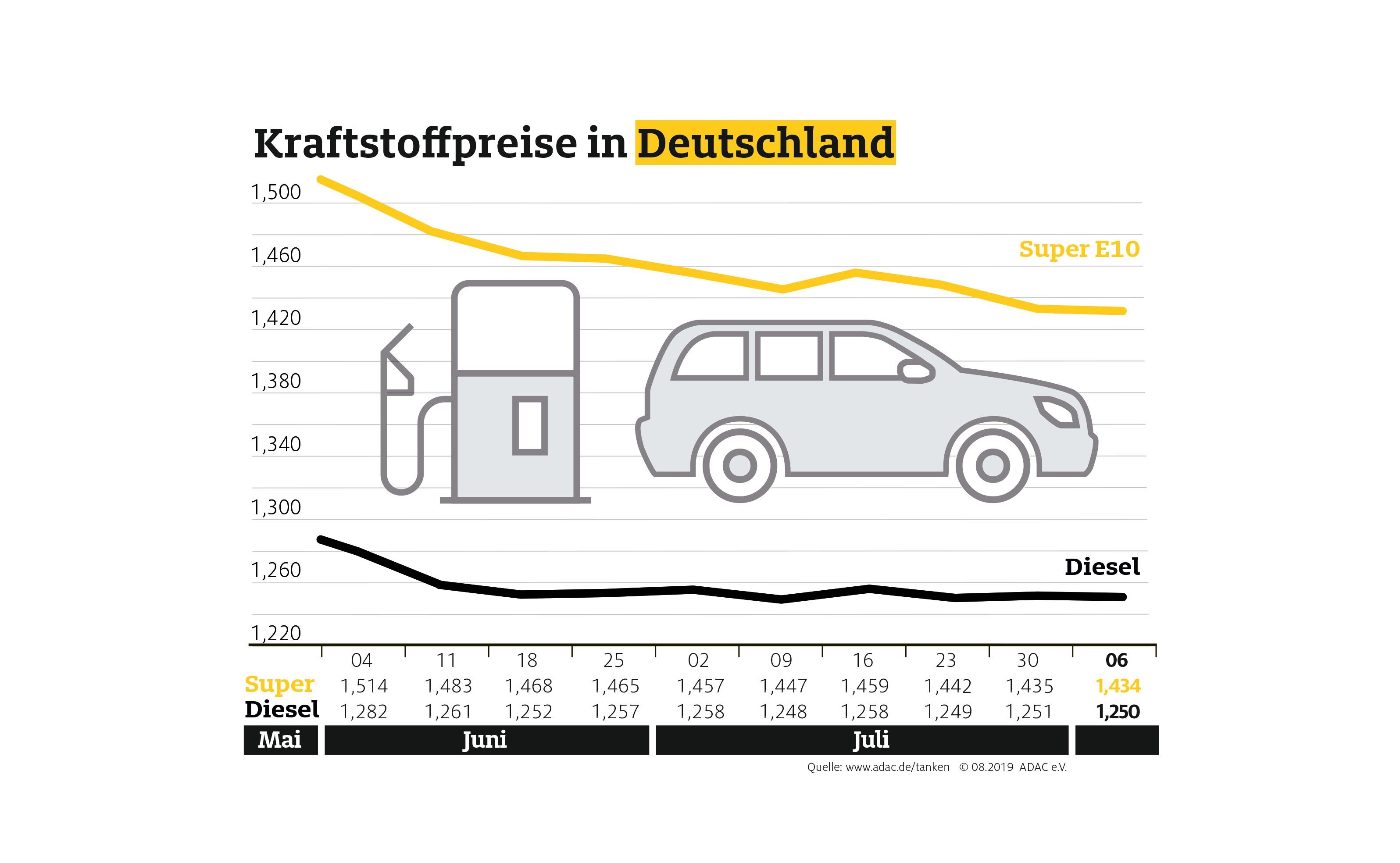 Die Preise für Benzin und Diesel sind derzeit stabil. Laut aktueller Auswertung des ADAC müssen Autofahrer für einen Liter Super E10 im Bundesdurchschnitt 1,434 Euro bezahlen, das sind 0,1 Cent weniger als in der vergangenen Woche. Ein Liter Diesel verbilligte sich im Mittel ebenfalls um 0,1 Cent auf 1,250 Euro.
